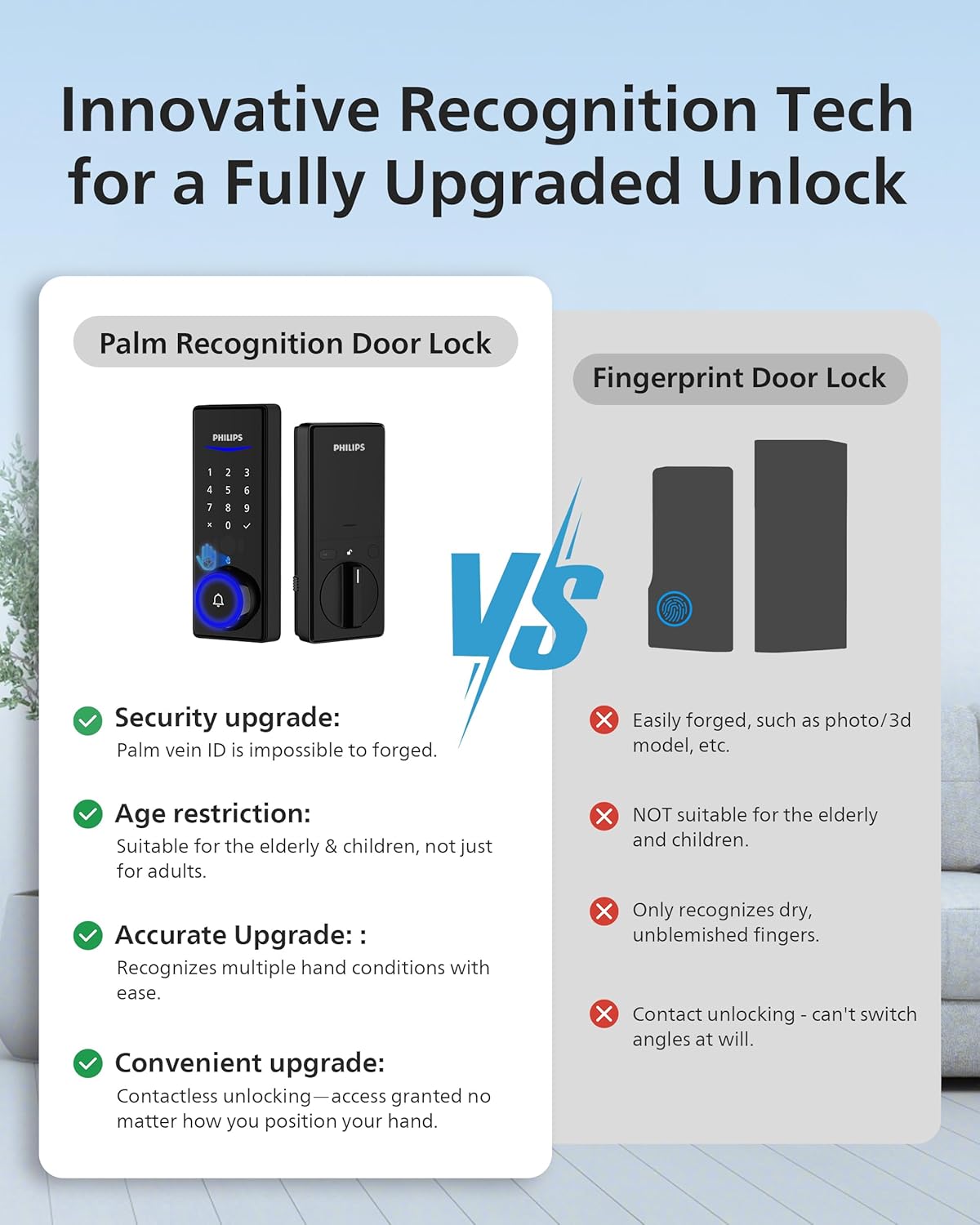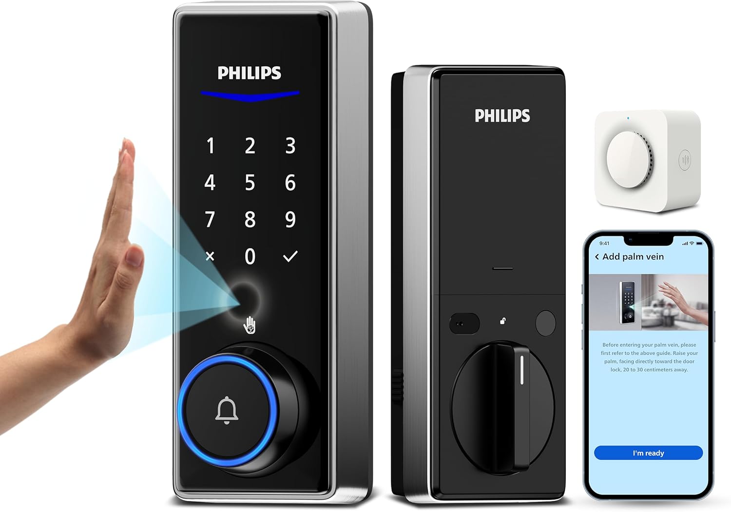 Philips Palm Vein WiFi Smart Lock, 2-in-1 Doorbell+Palm Vein Smart Locks for Front Door, APP Remote Control, Work with Alexa & Google Assistant, Keyless Entry Door Lock, Wireless Chime, Matte Black